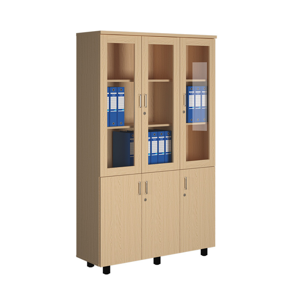 - Tủ tài liệu 3 khoang chất liệu gỗ công nghiệp phủ melamine, bên trên gồm 3 khoang khung cánh kính có khóa, trong có 2 đợt di động.